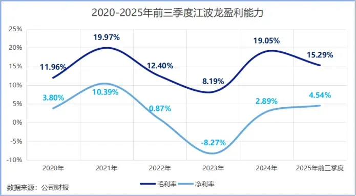 2021年至2024年,公司的毛利率经历了从19.79%下降至8.19%后再反弹至19.05%的起伏,2025年前三季度又降至15.29%。