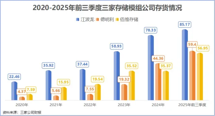 截至2025年前三季度,江波龙的存货金额攀升至85.17亿元的历史高位。这一存货规模远超德明利、佰维存储等同业。