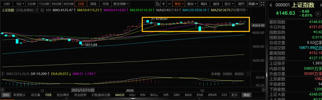 接下来,老铁说一下盘面的情况。今天市场出现低开高走,但直至收盘依然是翻绿的,好在还是平盘附近,大盘站上4146点之上,依然站上多条均线之上,高位震荡的迹象明显。