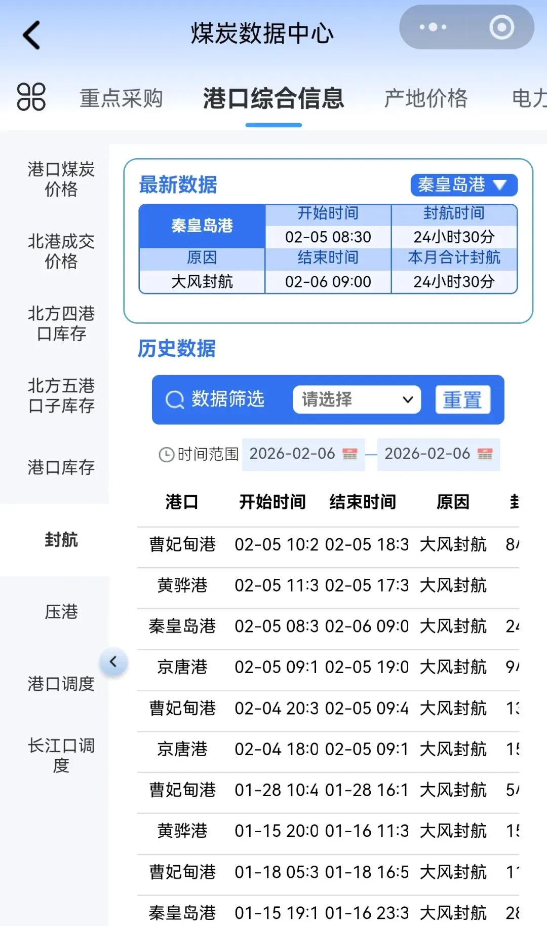 2026年2月5日曹妃甸港因大风封航,本次封航时间为8小时10分钟,本月累计封航时间为18小时15分钟;2月5日秦皇岛港因大风封航,本次封航时间为24小时30分钟,本月累计封航时间为24小时30分钟;2月5日黄骅港因大风封航,本次封航时间为6小时,本月累计封航时间为17小时10分钟;2月5日京唐港因大风封航,本次封航时间为9小时45分钟,本月累计封航时间为25小时;