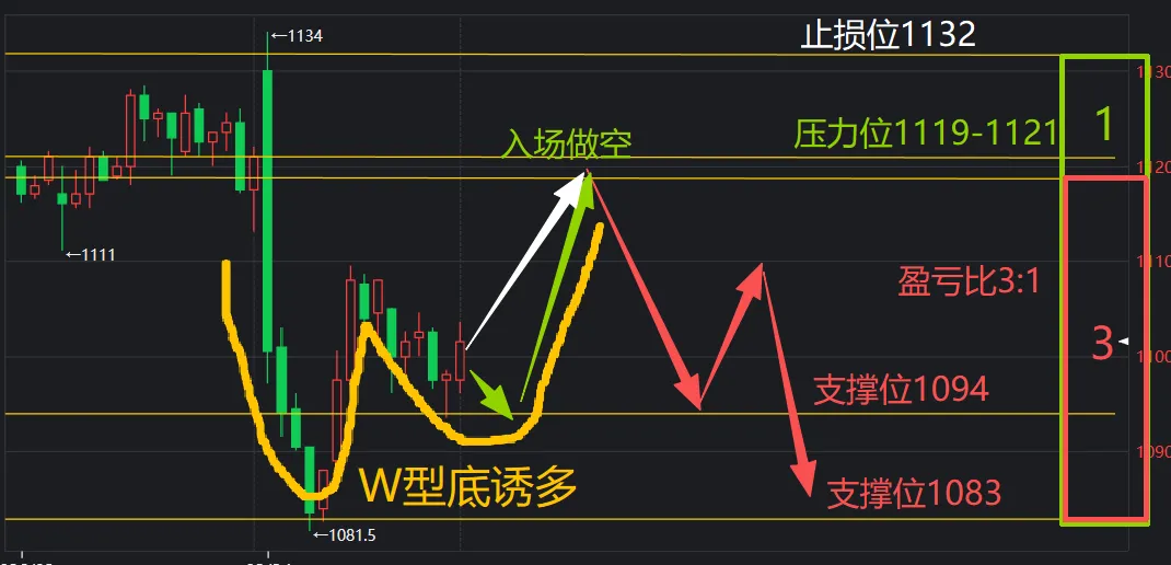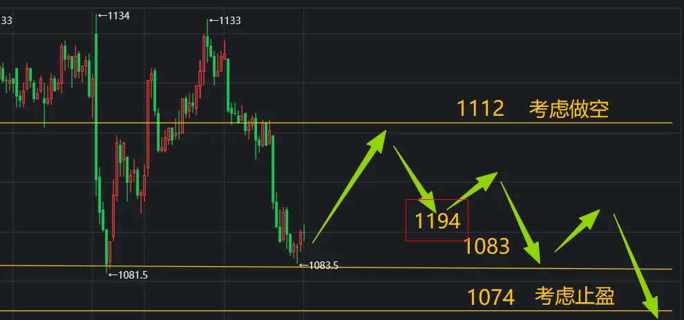 如果有机会,可以选择在这个位置入场做空,下方支撑1083,以及是1074。