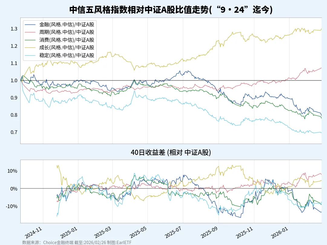 四大宽基中证2000从24年9·24行情以来遥遥领先,每轮牛市行情都是盘子越小越占优,牛市行情的雨露均沾体现到小盘的估值中,就是同样的业绩表现有更大股价弹性空间。今天是中证1000的0.74%涨势优于500的0.33%。中信五风格指数相对中证A股比值走势图,近期市场风格偏向周期,成长方向今天也表现不俗。主动策略中周期持仓方向上我重点持有化工和有色/黄金等,成长持仓方向重点持有芯片/电池/光伏和电网设备/消费电子等。总体持仓位走向进攻,进攻仓位提升至80%,20%在现金流和消费板块做防御。