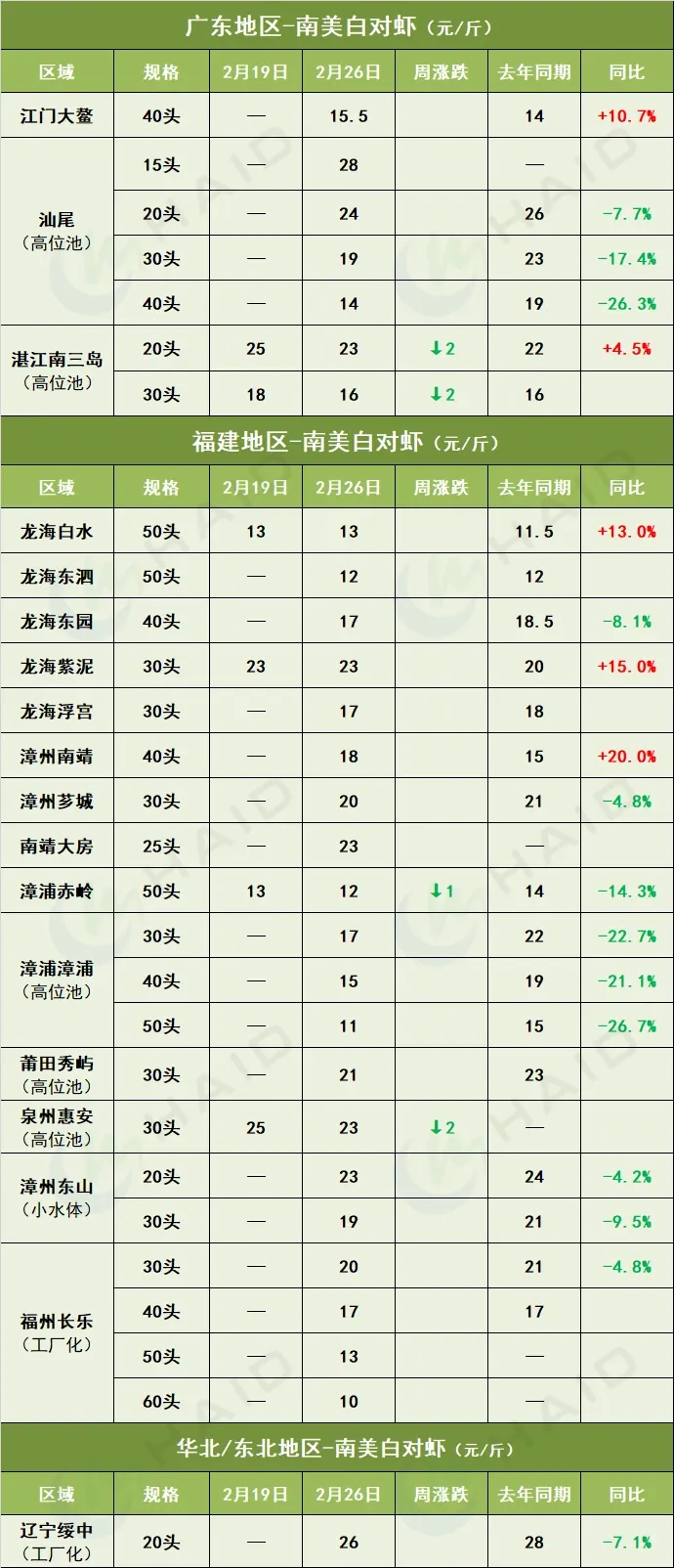 福建地区:龙海区域因节日已过,市场价格有所回调;紫泥区域30头价格小贩子稍微高点,其余会低一点;惠安市场节后消费下行,虾价下降;长乐市场年后大虾需求量下降,部分小棚虾上市拉低价格。