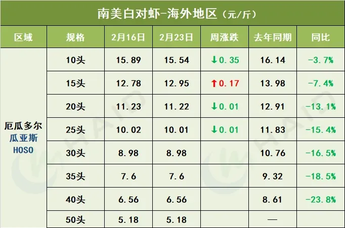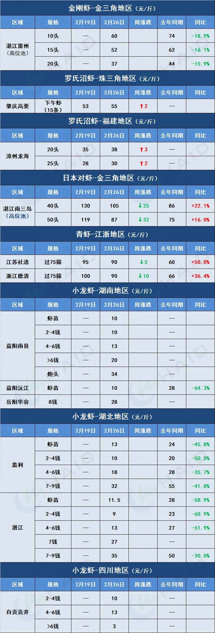 广东地区:春节过后,江门市场虾价稳中有降,预计后续上市虾数量较多;目前40条15-16元,33条17-18元,30条19-20元,24条21-22元。湛江南三岛市场由于暖冬,雨水少,养殖相对顺利,规格虾存塘较多,春节后消费需求下降,价格下跌比较明显。