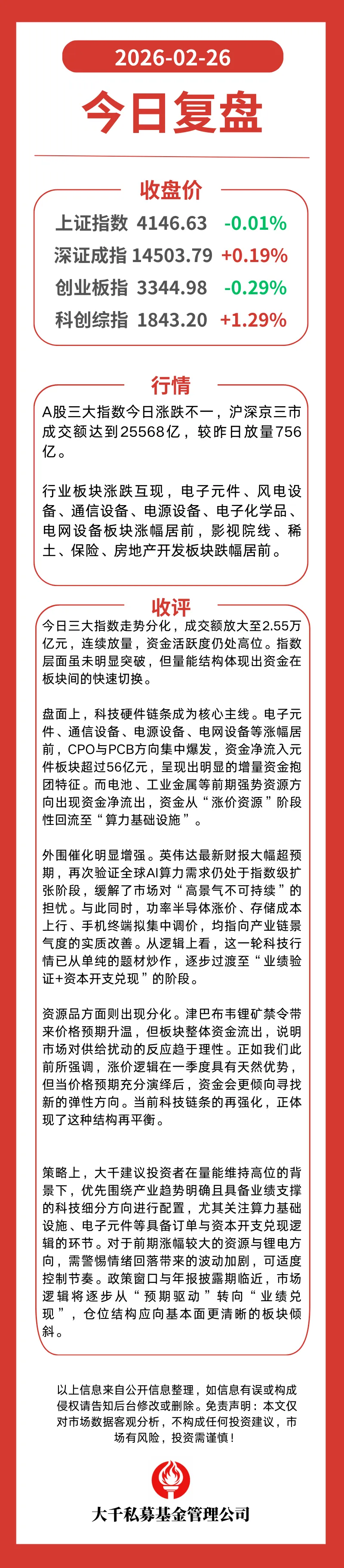 A股作业帮|放量滞涨分化,轮动行情,科技最亮眼(2026.2.26周四)
