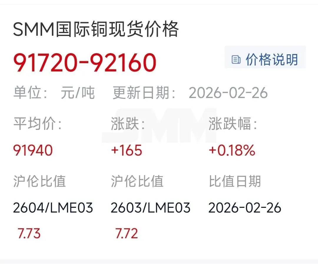 2026年2月26日铜价整体呈现高位震荡态势,并非大跌,不同品类铜价有涨有跌。具体情况如下: