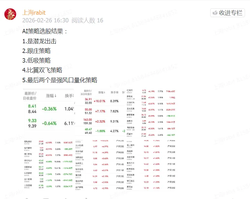 星球群里陈总搞了AI选股,我自己其实从去年10月就有参与AI策略制定,从今天开始,我逐步公布自己的AI选股策略根据行情走势 筛选出的标的,提供给大家。这些策略一要买交易所数据、二要有算力,劳民伤财,我逐步完善,提供给星球朋友。===============