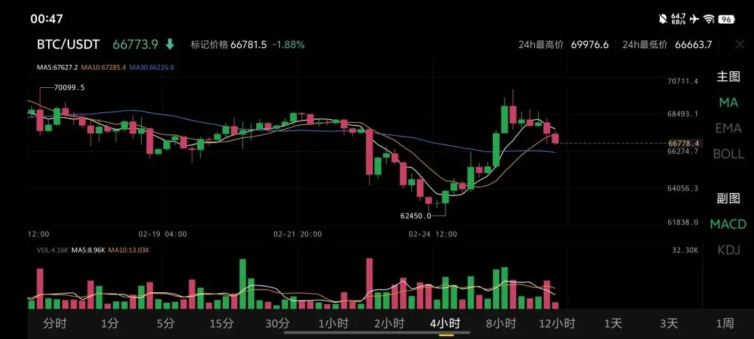 当前价格处于MA30(66226)上方,虽短期回调,但并未完全破坏中期震荡向上的结构。关键观察点在于66663.7(24h最低价)附近的支撑强度。