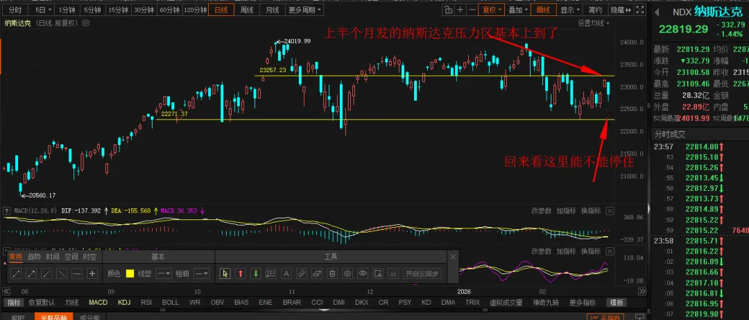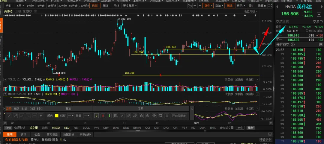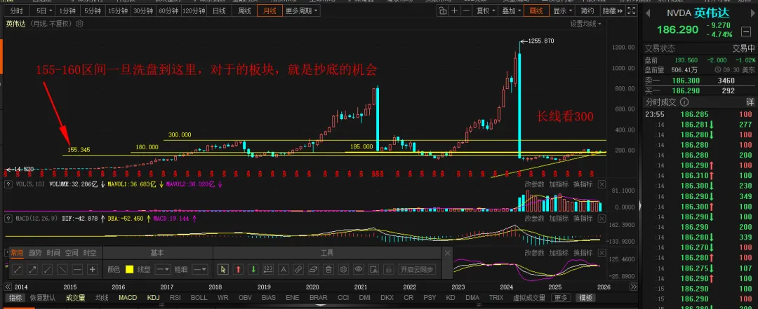 这是2月26日,英伟达业绩超预期后,单边跌幅5%,有意思吧只想说,英伟达,刚才到了185的支撑,下面还有一个180的支撑大家看着吧,如果185的支撑今天有效了,那么很快就会开启反弹英伟达我是比较看好的长期的,现在是185,长线我能看到300,有一天止于300的时候,就明白了其实没有正儿八经的主线,大家期望的机器人废了,AI邋遢了,算力也不及预期节前机器人没资金,AI红包也只有蓝色光标动了一下,其他的也一般,科大讯飞也不及预期,亏了达安基因还是辅助生殖的逻辑,暂时没破支撑,先拿到两会后面看看有没有相关政策吧。春节红包近百亿折腾,机器人轮番上演,和去年摇手绢翻天覆地的变化但是开盘,谁上春晚杀谁,全杀,多少散户开盘就追了机器人当天反抽的时候还开心的不行,多少人还炫耀,结果,第二天彻底蒙圈,还一路加仓,加个得,现在满意了,恶心不!是不是玩百达,天奇的人,比吃了苍蝇都难受!小金属算是半个主线吧,涨价逻辑,中国小金属有定价权,我一直不喜欢追涨,不是不敢,也不是不会,只是,有埋伏的逻辑,为什么让自己处于危墙之下!2月6日我发了七八个驻底抄底的票,虽然没有很牛的,但是都没亏有利润,随时出,想抗过压力,就报0利润,毕竟现在没有10个点的收益,超10个点,保5个,换空间是没问题的,操作上没有规划,输了一半。去年10月和节前,都提过4230的位置,但是拖到现在,这几天犹犹豫豫,思思念念,想上,上不去,下也下不去有希望走一个突破,上攻4160,慢走的话可能上4180,这个4190既然有了,就要破就不容易,卡两会,卡月线收盘,没有新题材,很难冲新高3月份,两会的变动很大的,3月份能减一下就减一下,抄底的票没有多少跌的空间,仓位小点,无所谓,但是尽量别追涨,现在没有值得追涨的题材。之前说3月可能到4230,然后又大调整,这个真要注意一点整体就是量能很足但指数涨不动、华为链 要看看,2 月 27 日周五能冲4180再调整就不错了