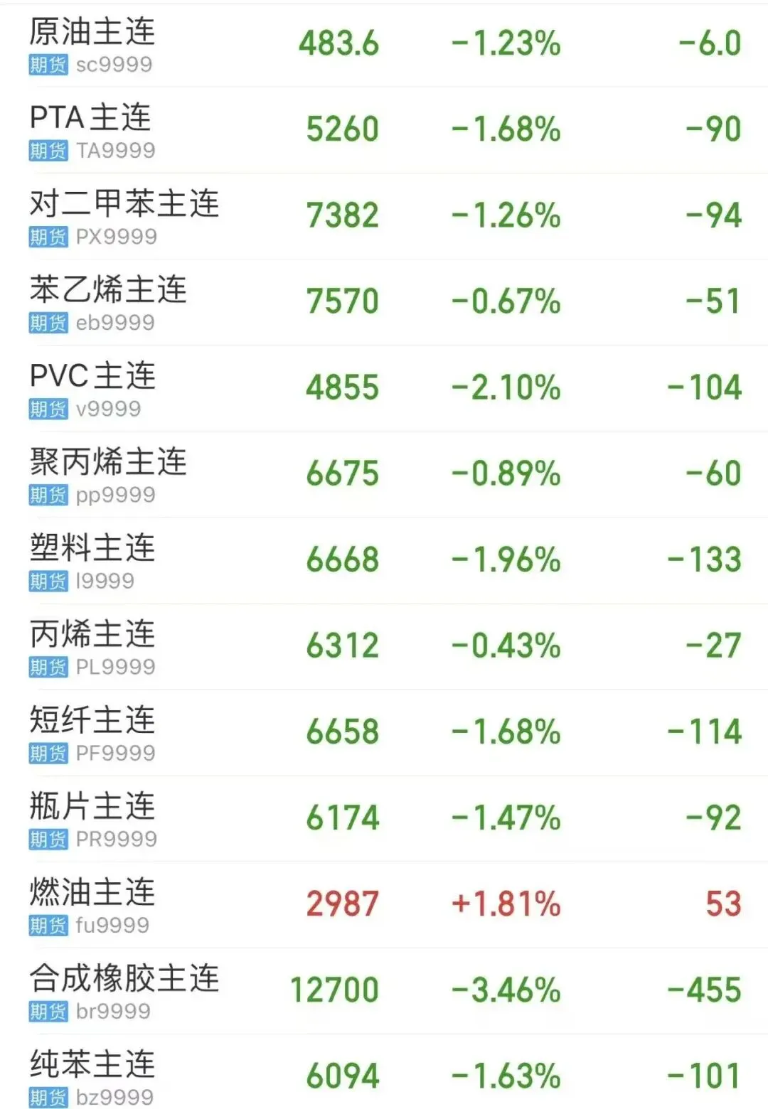 再看咱们最关心的塑料市场,截止周四收盘,PVC跌2.1%,塑料跌1.96%,短纤、PTA跌1.68%,瓶片跌1.47%,对二甲苯跌1.26%,原油跌1.23%,PP、丙烯、纯苯等均有不同程度跌幅。现货市场整体也是偏弱运行:
