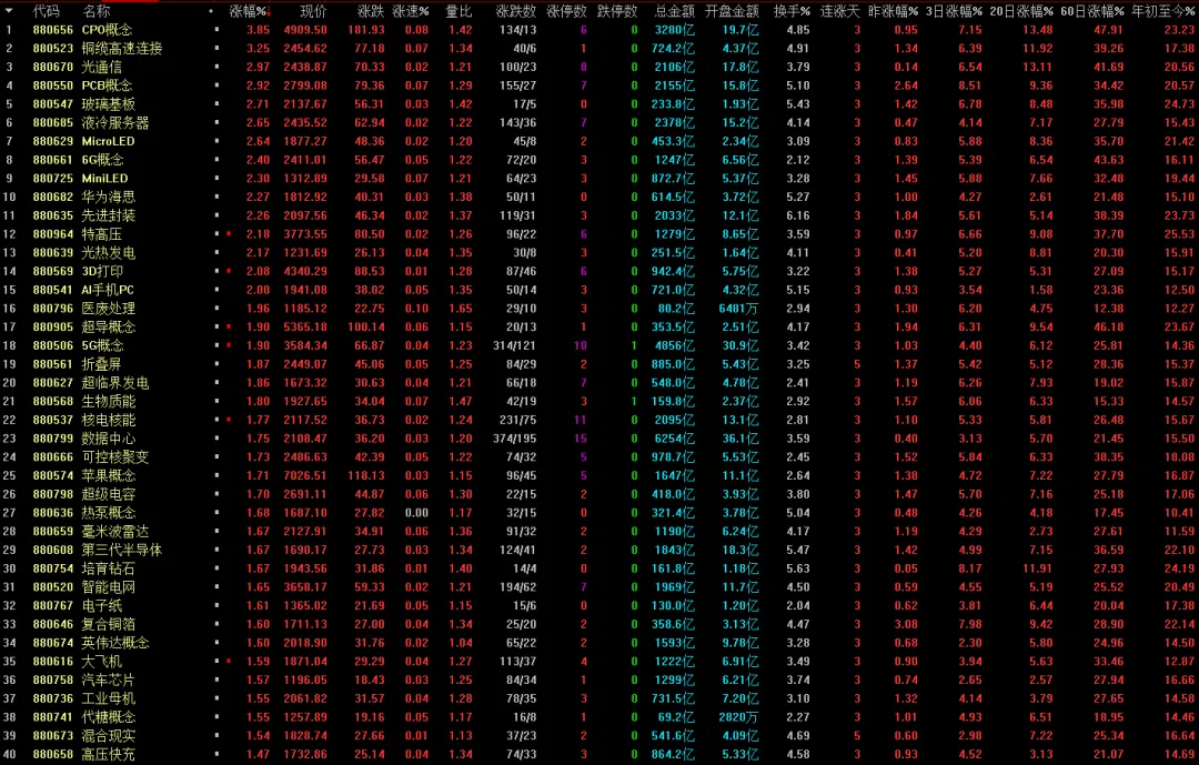 从板块来看,算力硬件方向涨幅居前,PCB、CPO、液冷服务器、算力芯片概念均表现强势,电力板块走强,燃气轮机概念集体大涨。
