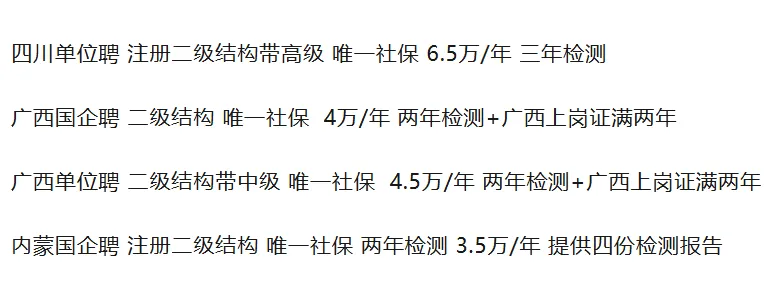 本文所贴信息来自于招聘网站、guakao网站、土木类公众号、微信群、QQ群等渠道汇总的信息,有很高的也有很低的。大部分都是真实的,当然少不了用高价吸引加联系方式的中介。