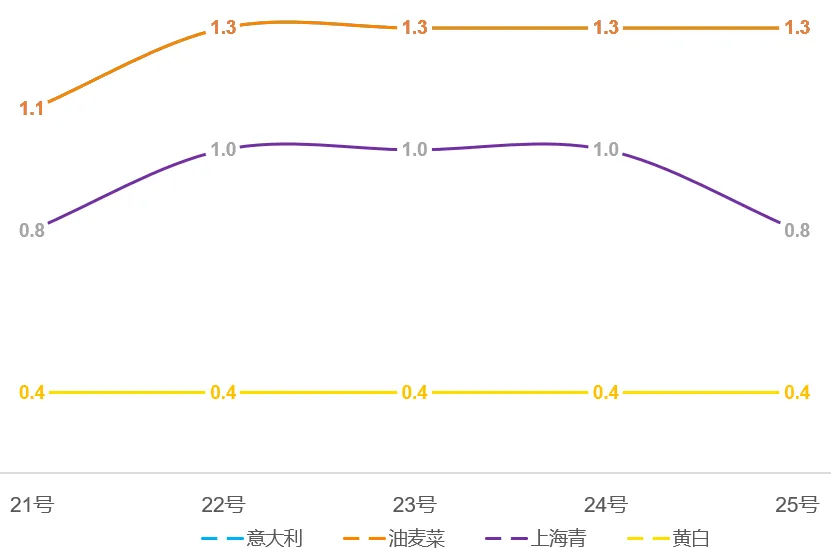 本周(2月19日至2月25日),除2月19日至20日春节假期暂停报价外,蔬菜价格整体小幅上涨。上涨的主要原因在于运输环节出现阶段性阻滞。受春节返程高峰影响,多条高速公路出现拥堵,导致从产区发往销区的运输车辆大量滞留途中,市场短期到货量不足,造成销区局部供应紧张,从而推高了菜价。随着后期各地学校陆续开学,食堂采购需求释放,预计市场走货速度将有所加快。具体本周晋宁四大金刚价格小幅上涨。截至2月25日,意大利价格对比上周上涨18%左右,油麦菜价格对比上周上涨18%左右,上海青、黄白价格对比上周保持不变。陆良产区四大金刚价格有涨有跌,油麦菜价格对比上周上涨11%左右,上海青价格对比上周下跌13%左右,意大利、黄白价格对比上周保持不变。图表1:本周昆明蔬菜价格走势图(元/公斤)