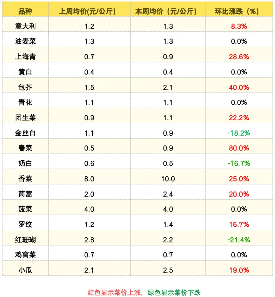 本周菜价小幅上涨。具体本周:意大利、油麦菜、包芥、团生菜、金丝白、春菜、奶白、茼蒿、罗纹、红珊瑚价格小幅上涨;黄白、青花、香菜、菠菜、鸡窝菜价格保持平稳;上海青价格先上涨后下跌;小瓜价格先下跌后上涨。图表3:本周(2月19日--2月25日)昆明产区蔬菜日价格(元/公斤)