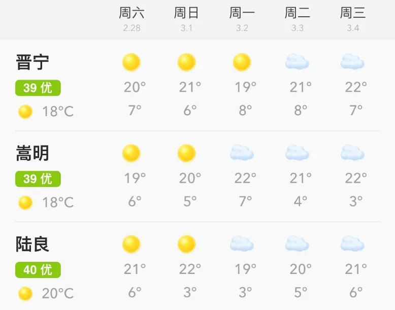 接下来,云南省云南大部地区晴间多云,东北部和南部边缘多分散阵雨。从具体产区来看,晋宁:6℃~22℃,晴转多云;嵩明:3℃~22℃,晴转多云;陆良:3℃~22℃,晴转多云;天气会对菜的品质产生一定影响,建议相关部门和农户留意天气预报,提前做好防范措施。图表5:云南蔬菜主产区天气预报图