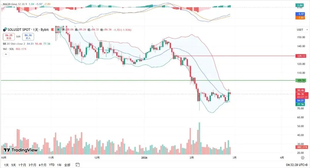 在下跌后MACD红柱动能衰减,大概在85u的价位区间盘整一下。