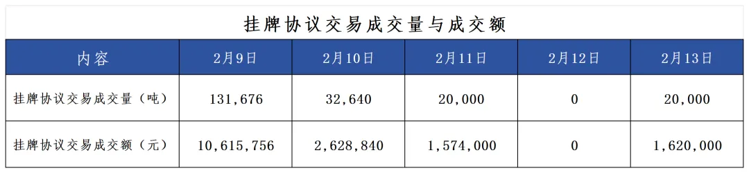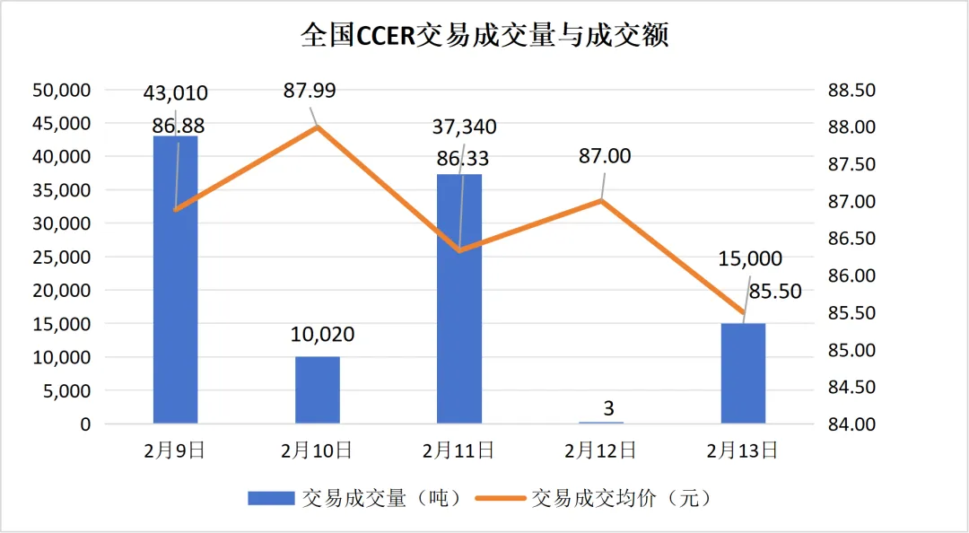 2月9日至2月13日,当周共有5个交易日。当周挂牌协议交易仅在12日无成交量,其余交易日均有成交量;大宗协议交易仅在13日无成交量,其余交易日均有成交量;本周无单向竞价。当周碳价呈波动下降趋势,最高价82.00元/吨,最低价78.00元/吨,收盘价较上周五上涨3.36%。本周总成交量1,804,316吨,相比上一交易周大幅上涨。当周全国CCER价格较为波动,最高成交均价87.99元/吨,最低成交均价85.50元/吨。周五成交均价为85.50元/吨,较上一个交易周的周五成交均价85.50元/吨相持平。当周全国CCER成交总量为105,373吨,较上一交易周的240,584吨下降56.20%。截至2026年2月13日,全国温室气体自愿减排交易市场累计成交量10,622,517吨,累计成交额758,974,944.59元。上周仅上海、湖北、广东、福建4个区域碳市场有配额成交,交易总量为83675吨。其中,上海碳市场活跃度最高,当周成交量达到了82010吨,湖北、广东碳市场成交总量上周分别居于第二和第三。