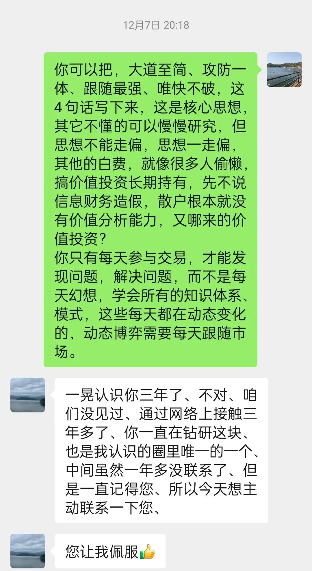 交易,是概率与风险的博弈,没有什么是必涨和必跌的,一切都是概率游戏。决定涨跌的,是市场环境变化和主力大资金的态度,不是我们的主观幻想,所以必须控制风险,具体操作上就是“坚持每天分仓3~5个票和简单统一的买卖点,也叫一致性操作。炒股就像上班一样,必须坚持统一标准,你今天上班明天不上班,今天工作明天不工作,这么随意能挣钱吗?同样的,如果你今天分仓明天不分仓、今天买明天不买、今天止损明天不止损、每天随意改变交易原则,这样能长期挣钱吗?”