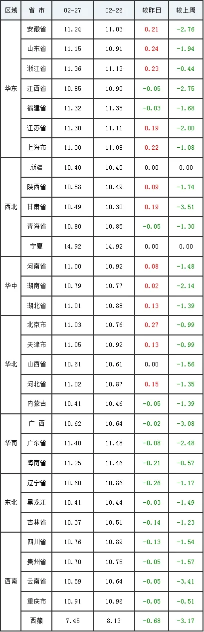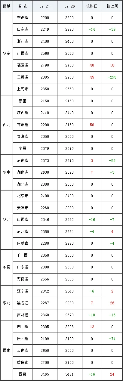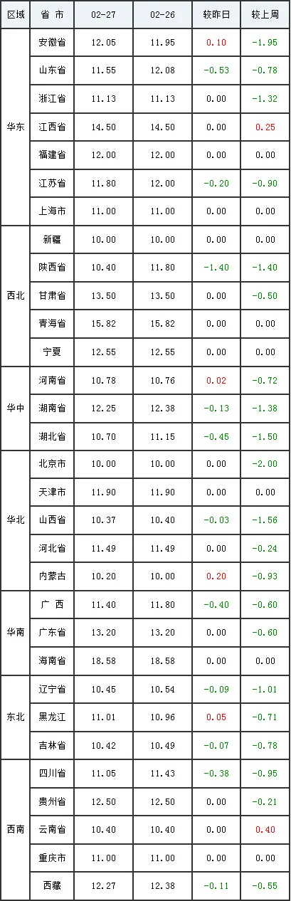 2月27日全国外三元生猪价格行情涨跌表