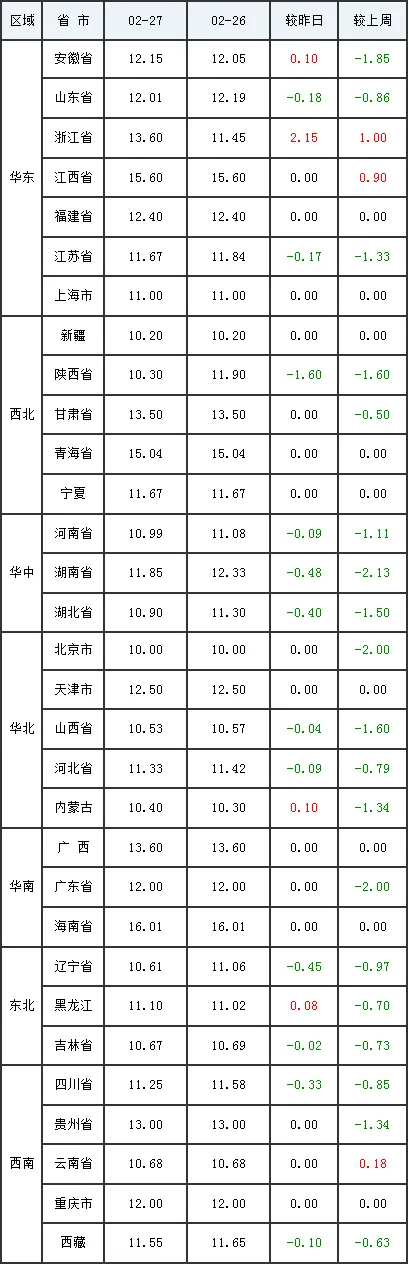 2月27日全国内三元生猪价格行情涨跌表