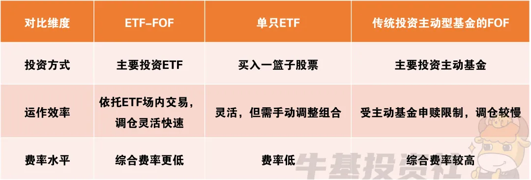 简单来说,ETF-FOF就是“ETF的精选管家”——它本质是FOF基金,但有明确的投资约束:投资于ETF的比例不低于非现金基金资产的80%。与单只ETF、传统主动型FOF相比,ETF-FOF形成了“三重优势”,我们用一张表清晰对比: