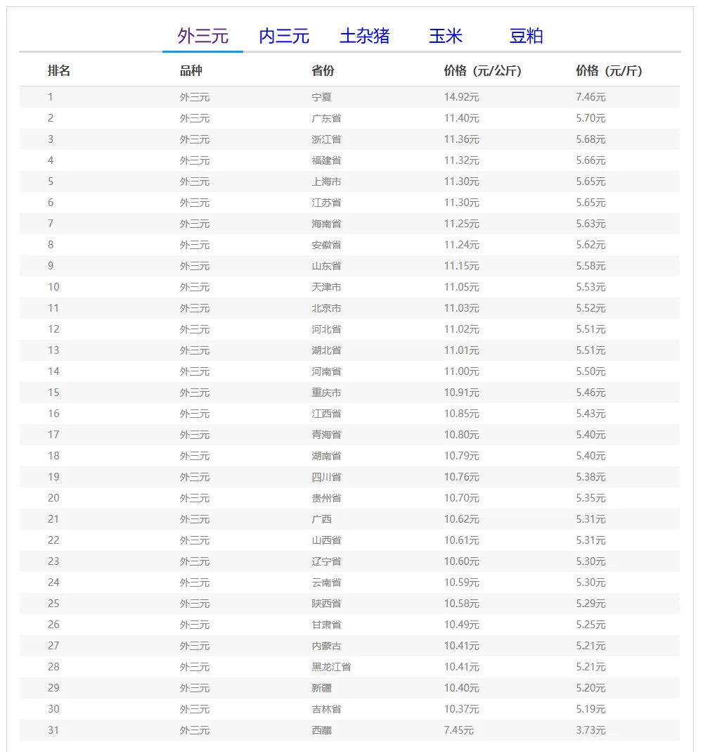全国外三元生猪价格走势图及涨跌表