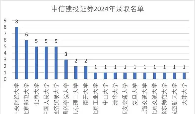 2024年中信建投在京校招名额是46人,其中,中央财经大学8人,北京邮电大学6人,北京大学5人,中国人民大学5人,外经贸5人,中国科学院大学3人,北京理工大学2人,南开大学2人,其他院校各1人(北京工业大学、中山大学、清华大学、西安交通大学、复旦大学、上海交通大学、北京交通大学、华东师范大学、北京航空航天大学、天津大学)。