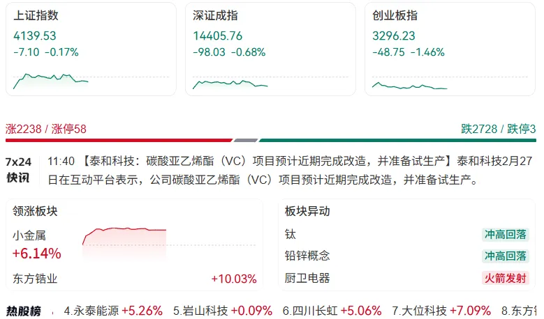 今日(2026年2月27日上午收盘)上证指数收盘报4139.53点,较前一交易日下跌7.10点,跌幅为0.17%。以下是今日上证指数及股票行情的详细分析: