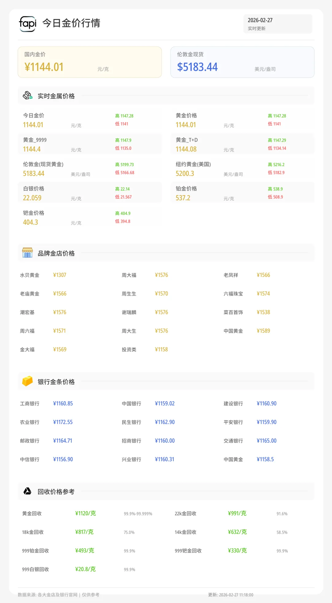 黄金回收今日价格行情:黄金回收实时价格每克1120元,铂金回收价格每克493元,钯金回收价格每克330元,18k金回收价格每克817元,白银回收价格每克20.6元。