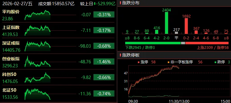 市场早盘震荡调整,沪指再度翻绿,创业板指跌超1%,黄白线明显分化。沪深两市半日成交额1.59万亿,较上个交易日缩量530亿。盘面上热点快速轮动,全市场超2900只个股下跌。截至收盘,沪指跌0.17%,深成指跌0.68%,创业板指跌1.46%。
