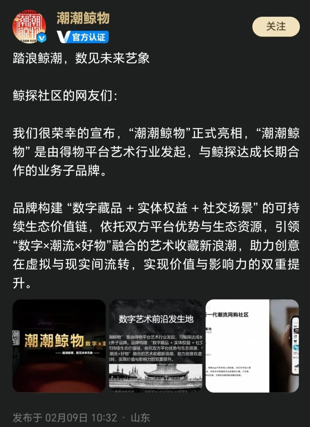 原来,这个「潮潮鲸物」是由「得物」平台艺术行业发起,与「鲸探」达成长期合作的业务子品牌。