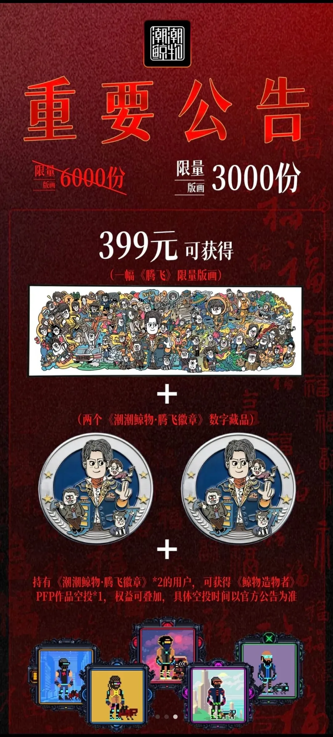 最关键的不是“潮潮鲸物•腾飞徽章”,而是《鲸物造物者》PFP。这个《鲸物造物者》PFP最大发行量应该为3000份,可能比较值钱,值得重点关注一下。