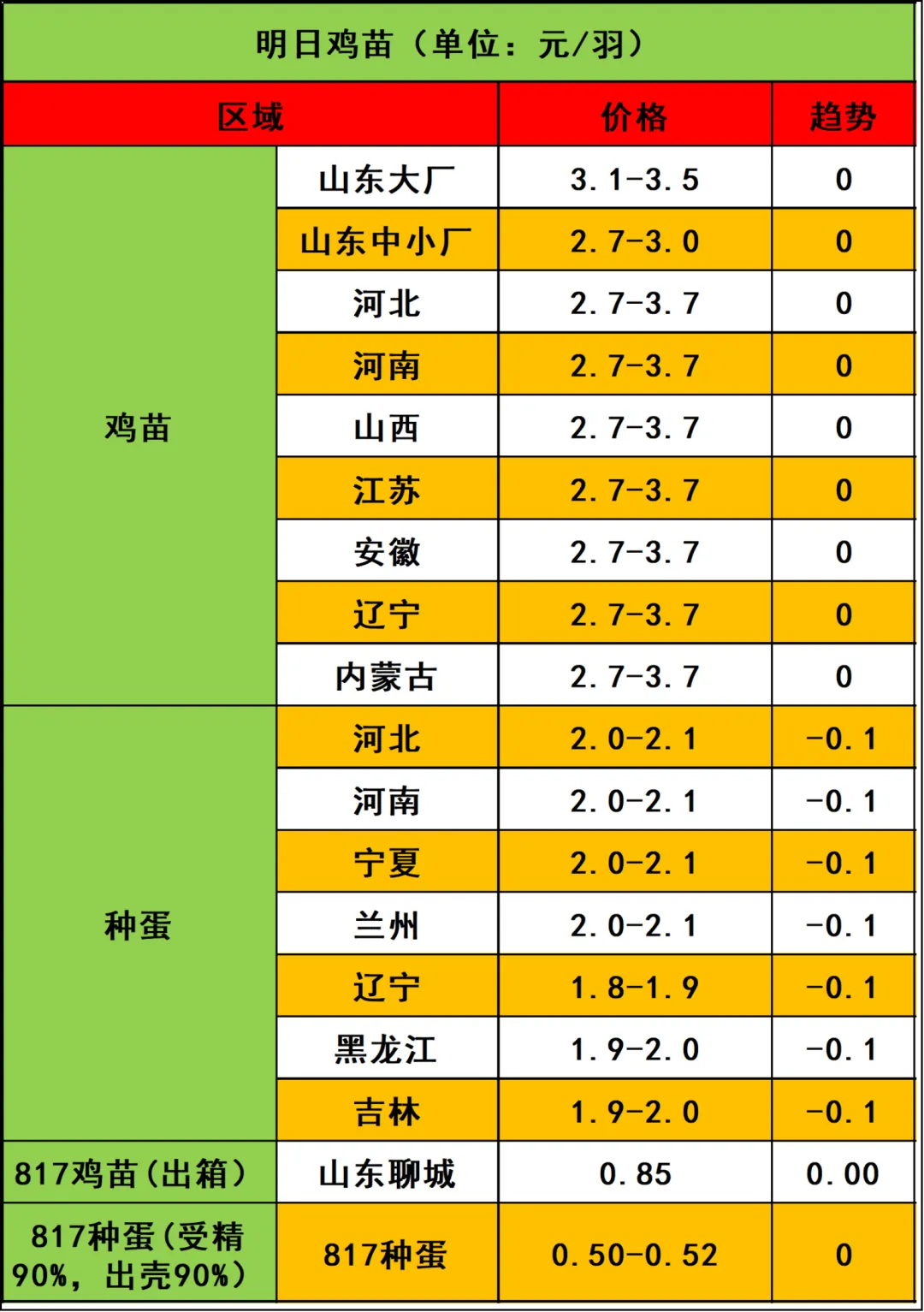 温馨提示:以上所报817鸡苗、种蛋价格因地点以及采集点不同,可能存在一些差异,比本报价高或低均属正常,本报价仅供参考,请以当地实际成交为主。