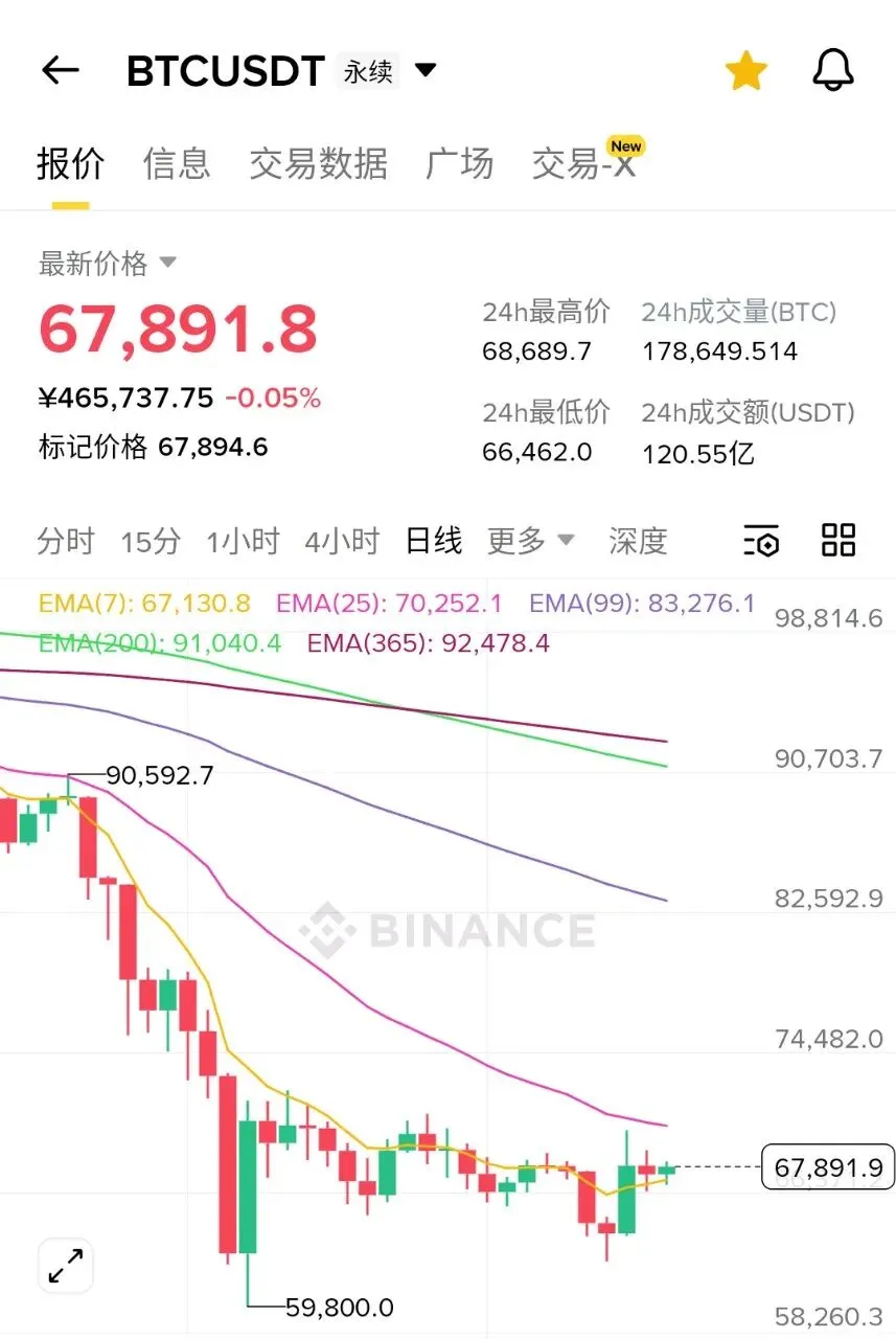 当前价格:约 $67,600(≈¥46.7万),24小时跌幅 -1.0%~-1.2%