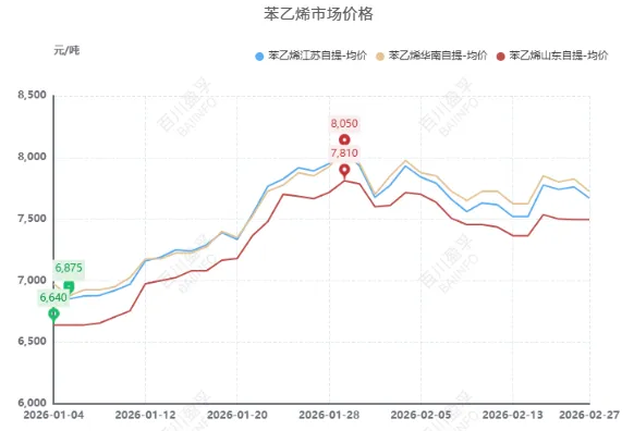 2026年苯乙烯市场行情开年整体走势上涨,1-2月华东现货平均价格低端位置在1月初6850元/吨,高端价格位置在1月底8050元/吨。