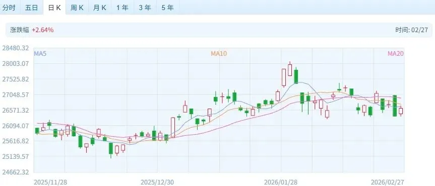 截至收盘,恒生指数报26630.54点,上涨249.52点,涨幅0.95%。整个二月行情,恒生指数累计下跌2.76%