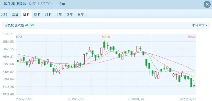 恒生科技指数今日也小幅反弹,最终收盘报5137.84点,上涨28.51点,涨幅0.56%。二月以来,恒生科技指数累计下跌10.15%。