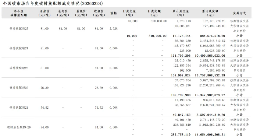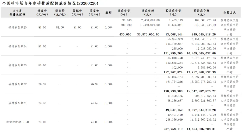 截至2026年2月27日,全国碳市场碳排放配额累计成交量879,288,326吨,累计成交额58,724,618,513.87元。