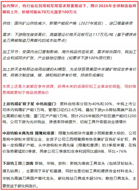 前天给大家科普的金属钨,给大家科普的7家公司,涨停潮小圈子里分享的钨龙头和钽龙头,再次大表演,恭喜小圈子的小金属朋友们,上台领奖对比工业金属,小金属的钨、钽、锑、锡等涨的更猛,所以股价方面也更凶大逻辑一直不曾变化,就是涨价,涨价的原因也给大家反复科普了,地缘催化,如全球地缘矛盾升级叠加资源民族主义;美联储降息周期,通胀大环境有助于商品资源涨价;国内反内卷帮助相关行业加速清理落后产能如果要再加一条逻辑的话,就是四季度以来,部分调仓科技的资金持续拥抱了周期资源股,高盛最新观点认为,AI恐慌下的真正避风港是“HALO”股票 (Heavy Assets, Low Obsolescence) 即重资产、低技术淘汰风险,而矿产资源股就属于这一类包括电网、电力设备、制造设备、关键机械.........在AI时代和新的宏观范式下,市场的领导力正在从依赖人力资本和数字化的“轻资产”模式,转向依赖实物资本和基础设施的“重资产、低淘汰率”模式。投资者需要关注这一重大的风格轮动把时间周期拉长来看,从熊转牛起点到现在,2024年924~2025年三季度,以AI科技股为完全主导,2025年四季度~之后,过度拥挤和预期业绩充分演绎后,其他主角陆续站上舞台,甚至开始反超,如周期资源而AI科技的炒作也更精细化,选股难度和操作也比以前更高,如|“易中天”涨天不涨易中,如AI电力相关领域表现明显好于其他,如光模块pcb炒的是他俩的上游和更高端细化CPO、钻针、电子布等......开年以来的四个交易日还蛮有规律,第一天和第二天油气、化工、金属等周期资源股领衔,第三天他们回落然后轮到CPO、燃机、PCB、液冷等领涨,今天有点雨露均沾,小金属涨幅第一的情况下,很多科技品种也在反弹大家周末愉快!!!