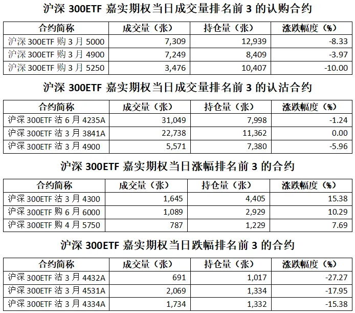 沪深300ETF嘉实期权总成交面额68.53亿元,减少9.18%,期现成交比为0.01,权利金成交额0.54亿元;期权总成交量146,369张,减少9.51%,其中认购期权成交量49,681张,认沽期权成交量96,688张,认沽认购成交比率为1.95(上一交易日认沽认购成交比率为2.49)。