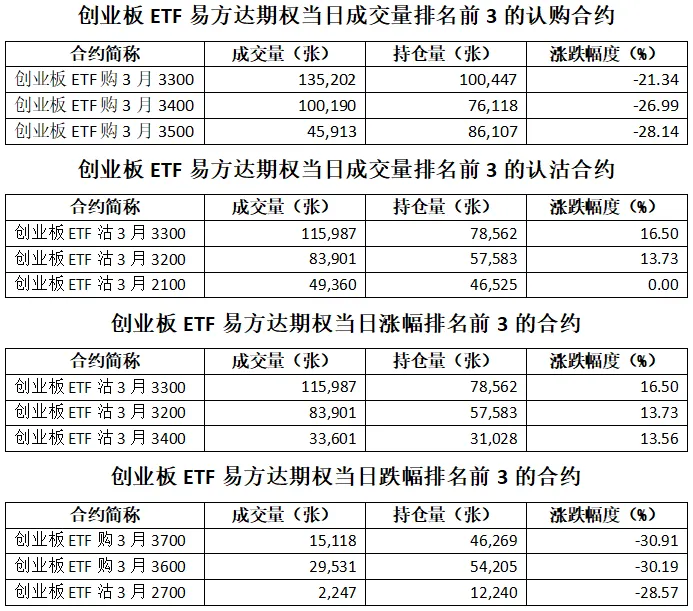 创业板ETF易方达期权总成交面额315.85亿元,增加0.98%,期现成交比为0.13,权利金成交额5.12亿元;期权总成交量1,015,608张,减少0.17%,其中认购期权成交量435,106张,认沽期权成交量580,502张,认沽认购成交比率为1.33(上一交易日认沽认购成交比率为1.51)。