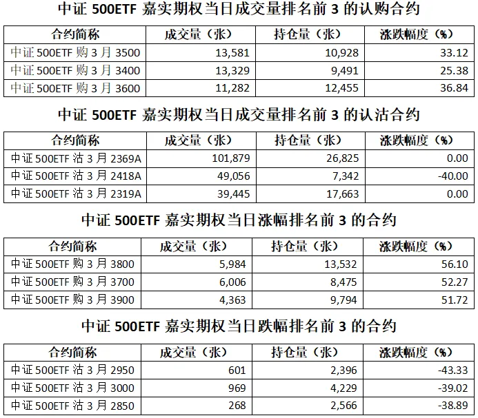 中证500ETF嘉实期权总成交面额103.97亿元,减少1.62%,期现成交比为0.02,权利金成交额0.88亿元;期权总成交量378,151张,减少3.86%,其中认购期权成交量73,084张,认沽期权成交量305,067张,认沽认购成交比率为4.17(上一交易日认沽认购成交比率为5.91)。