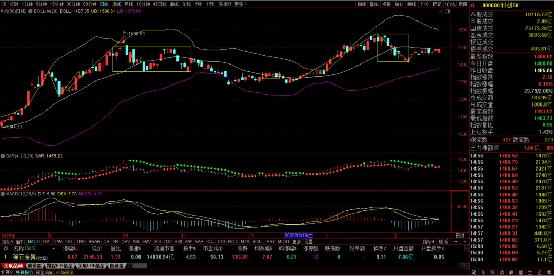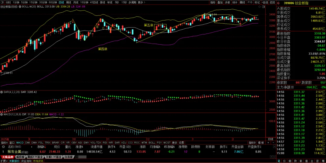 由于宁德时代、阳光电源的持续下行,还包括科技股的疲软,预计创业板下周将围绕布林线中轨震荡,上行趋势未变,但上行力度偏弱。