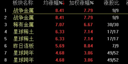 涨幅居前的前8是我们星球创设的战争技术,星球稀土和星球跨年组合。其中,星球战争金属涨幅8.41%,星球稀土涨幅6.33%,星球跨年股票池涨幅4.68%。