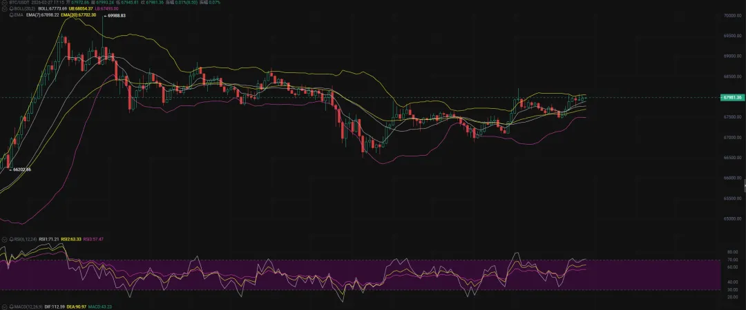 为什么我一直强调回踩一半再上去?因为只有洗掉不坚定的筹码,后面的反弹才会更扎实。现在既然回踩完成了,接下来的目标也很清晰:先看昨天日线的前高,突破之后再看前天的前高。这个位置可以考虑轻仓空一下,1%仓位试试水就行。如果大饼能冲破70000,那下一个目标就是72000附近,到时候可以考虑稳健一点的空单,仓位可以放大到2%。