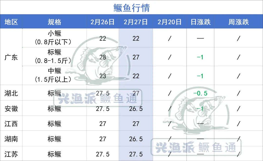 2月27日,广东标鳜跌1元/斤,中鳜跌1元/斤,湖北跌0.5元/斤,安徽跌1元/斤。