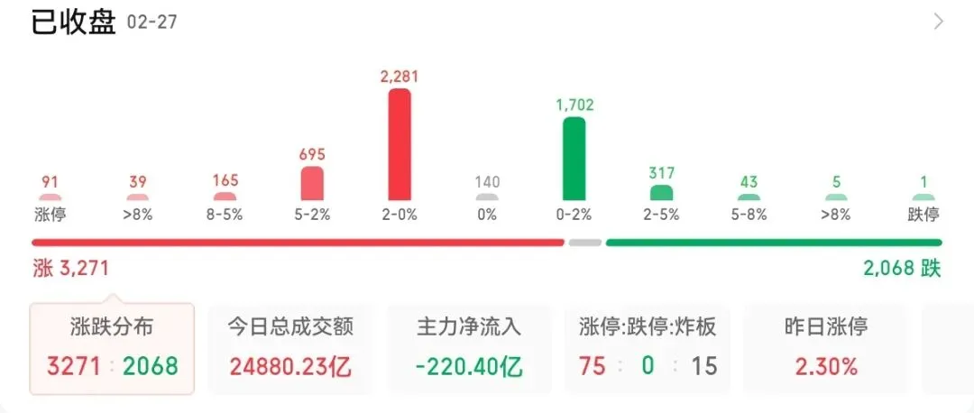 今日 A 股延续震荡上行态势,上证指数收报 4162.88 点,上涨 + 0.39%,站稳 4150 点关口;全市场3271 只个股上涨,2068 只个股下跌,涨多跌少,赚钱效应回暖,2月红盘收官,3月行情可期!