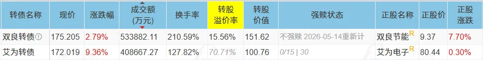 1、艾为转债:半导体、AI 芯片、消费电子概念,正股艾为电子微涨。AI 芯片国产化替代热点持续发酵,叠加新债上市的资金追捧,估值维持高位。高溢价下波动剧烈,需警惕板块轮动后的估值回归;若半导体板块持续强势,可依托正股企稳后的机会,严格设置止损。