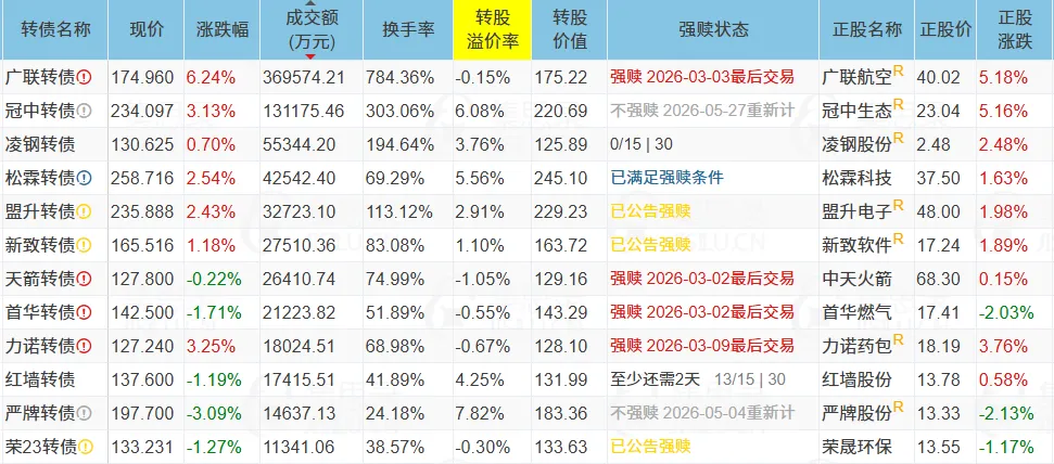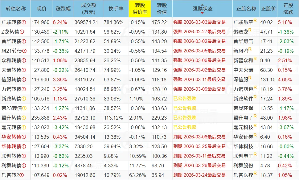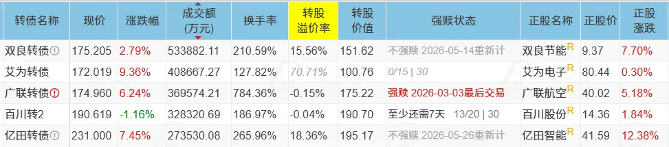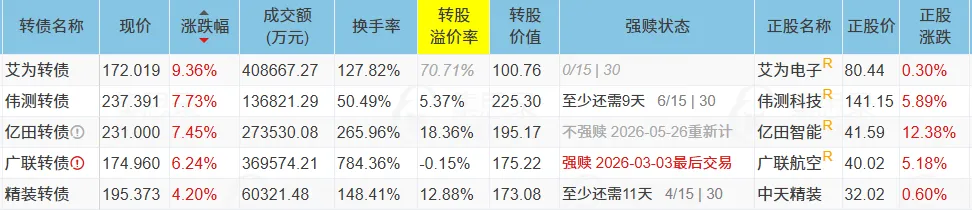 4、广联转债:航空航天、军工、无人机概念,正股广联航空上涨。军工板块因装备更新及地缘局势催化回暖,正股走强带动转债修复,负溢价提供安全边际。负溢价下具备转股套利空间,关注军工板块持续性,依托正股节奏操作。