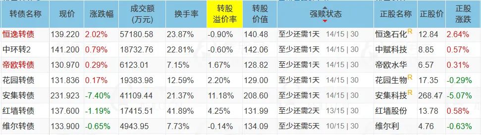 下周一收盘可能满足强赎:恒逸转债、中环转2、帝欧转债、花园转债、安集转债